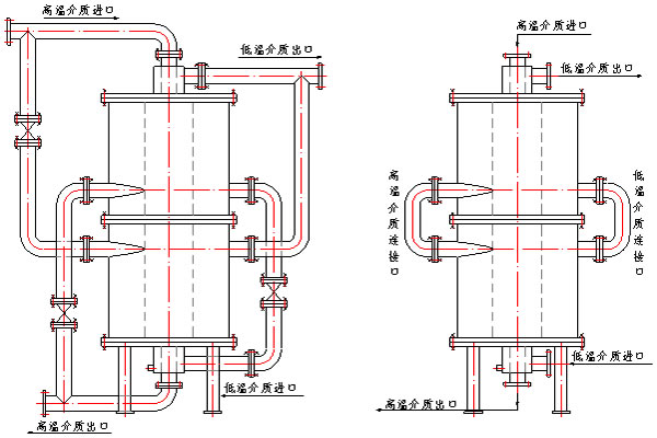 Ⅲ型簡圖 2、可拆式Ⅲ型可兩臺立式組合安裝,并聯或串聯運行(如下圖),減小安裝位置,可提高冷凝效果,加大被加熱介質使用溫度。